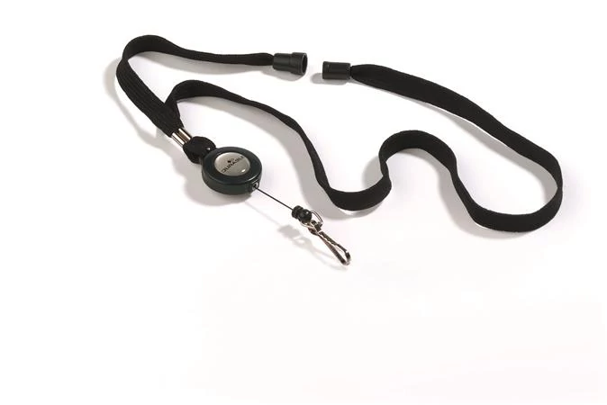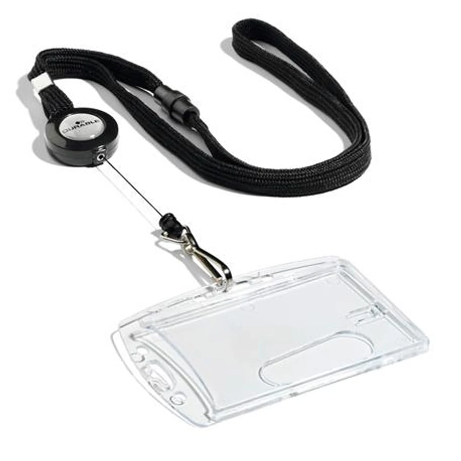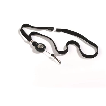Azonosítókártya-tartó, kihúzható, patentos, fekete nyakba akasztóval, DURABLE, 10db/cs