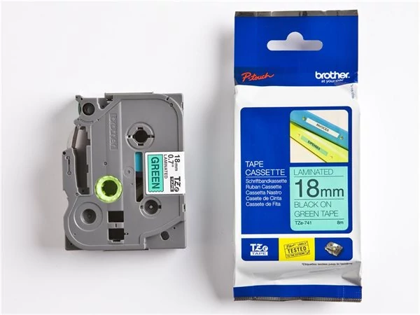 Feliratozógép szalag, 18 mm x 8 m, BROTHER, "TZe-741" zöld-fekete