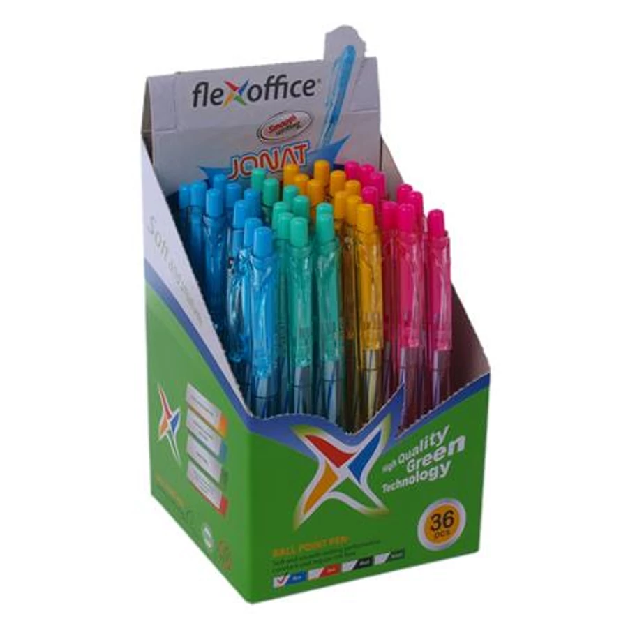 Golyóstoll, 0,25mm, nyomógombos, vegyes test, FLEXOFFICE "Jonat", kék, 36db/cs