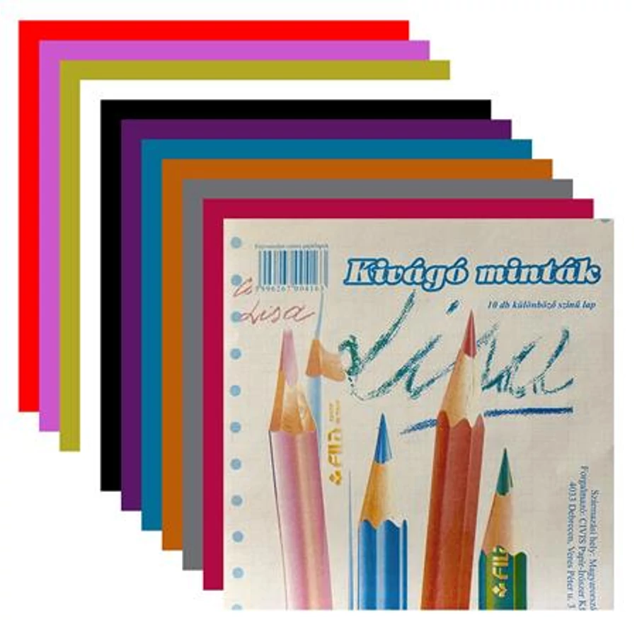 A kivágóminta csomag különböző színes lapokat tartalmaz