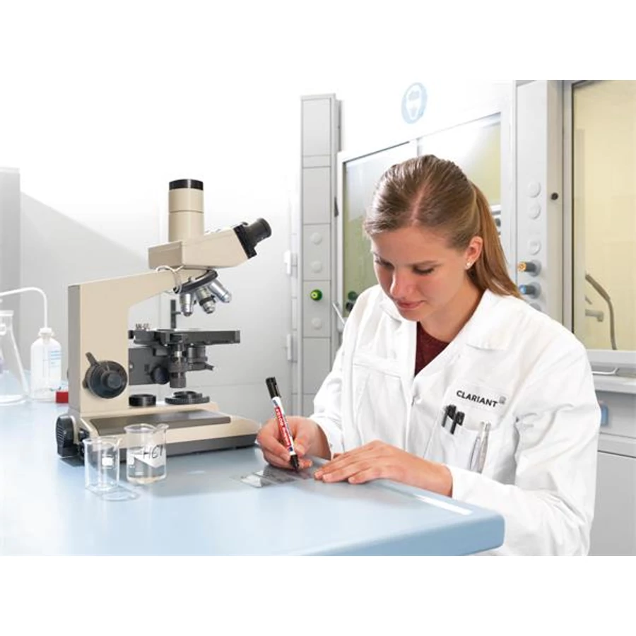 Sima és áttetsző felületek precíz jelöléséhez, pl. tárgylemezekhez, reakcióedényekhez és címkékhez alkalmas marker. Műanyag felületen permanens jelölést eredményez, üvegfelületekről eltávolítható. Extra gyorsan szárad, törlés- , víz-és fényálló, majdnem szagmentes. Kiváló fagy-, hő-és kopásállóságú.