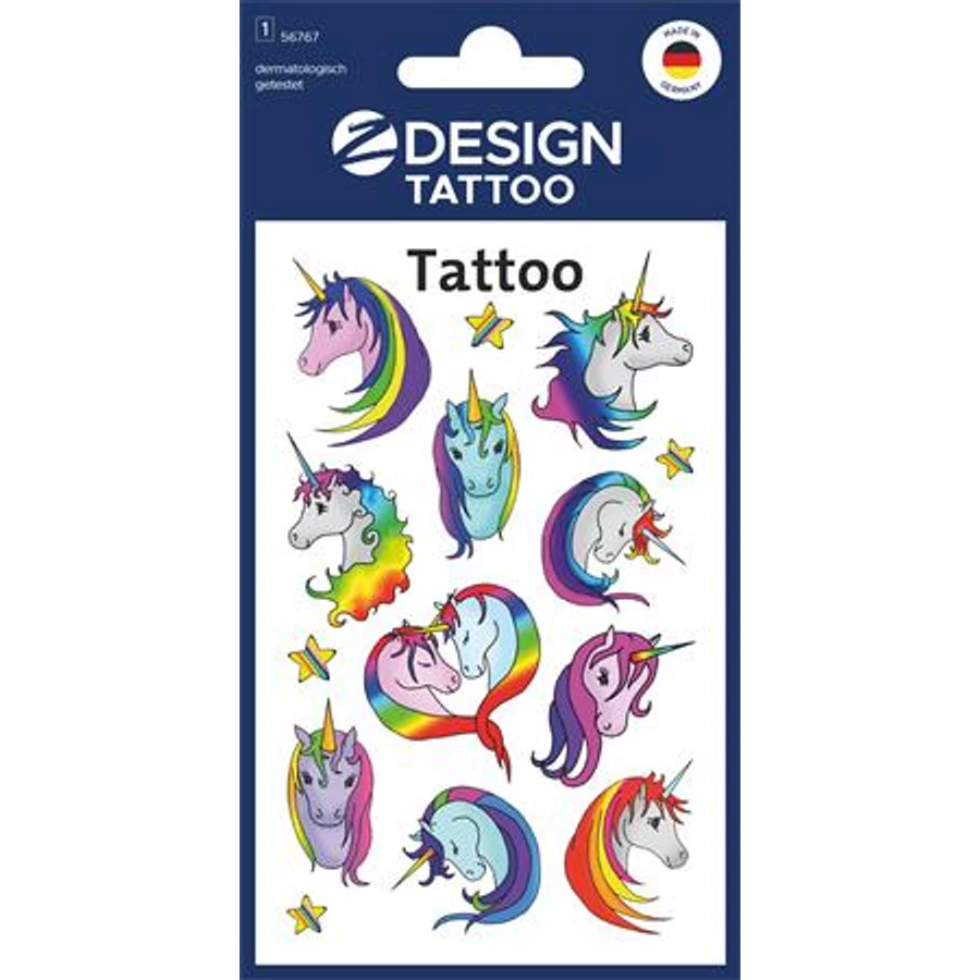 Unikornis tetoválás a varázslatos mesevilágból! Apró meglepetésként tökéletes ajándék lehet a hétköznapokban, születésnapi partikra vagy egyszerűen csak arra, hogy a gyerekek remekül szórakozzanak. Az ideiglenes tetoválás vízálló, és megtévesztően valódinak tűnik. Felhelyezése nagyon egyszerű, csak egy kevés víz kell hozzá, majd kis olajjal könnyen eltávolítható. A Németországból származó tetoválás természetesen gyermekbiztos, csúcsminőségű, dermatológiailag tesztelt és külső laboratóriumok által rendszeresen ellenőrzött. Élvezze saját tetováló stúdióját!