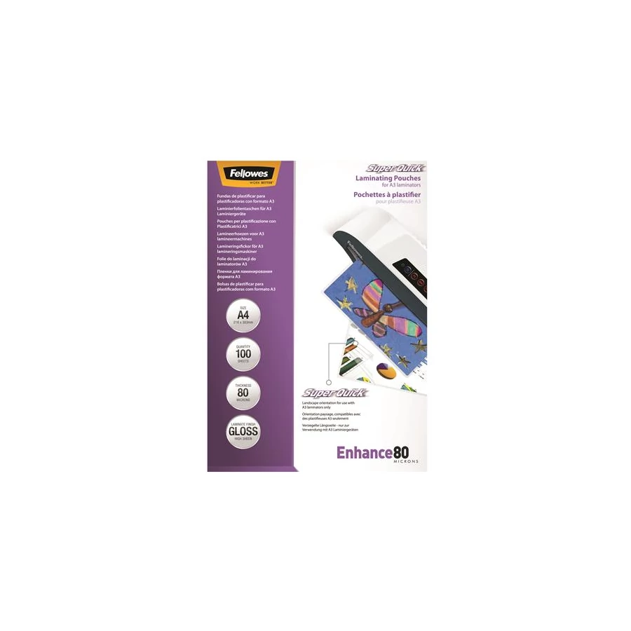 Meleglamináló fólia, 80 mikron, A4, SuperQuick, fényes, 100 db, FELLOWES