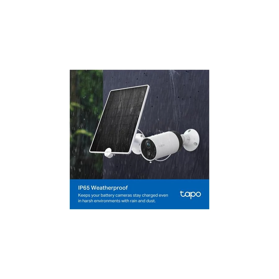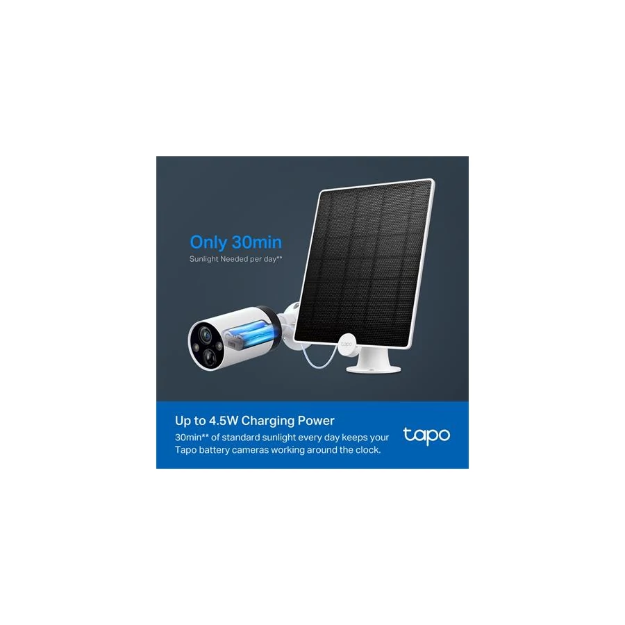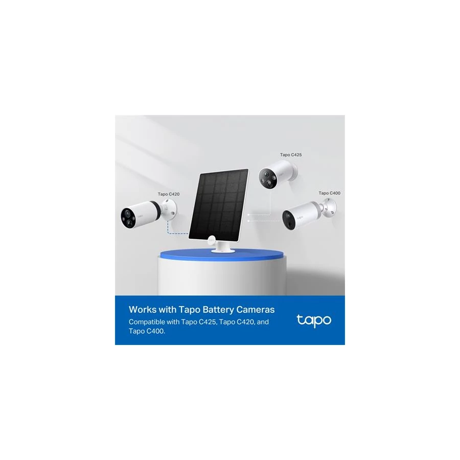 -ingyenes napelem energiával folyamatos tápellátást biztosít a Tapo akkumulátoros kameráihoz (Tapo C425, Tapo C420 és Tapo C400), hogy egész évben védelmet nyújtsanak Önnek