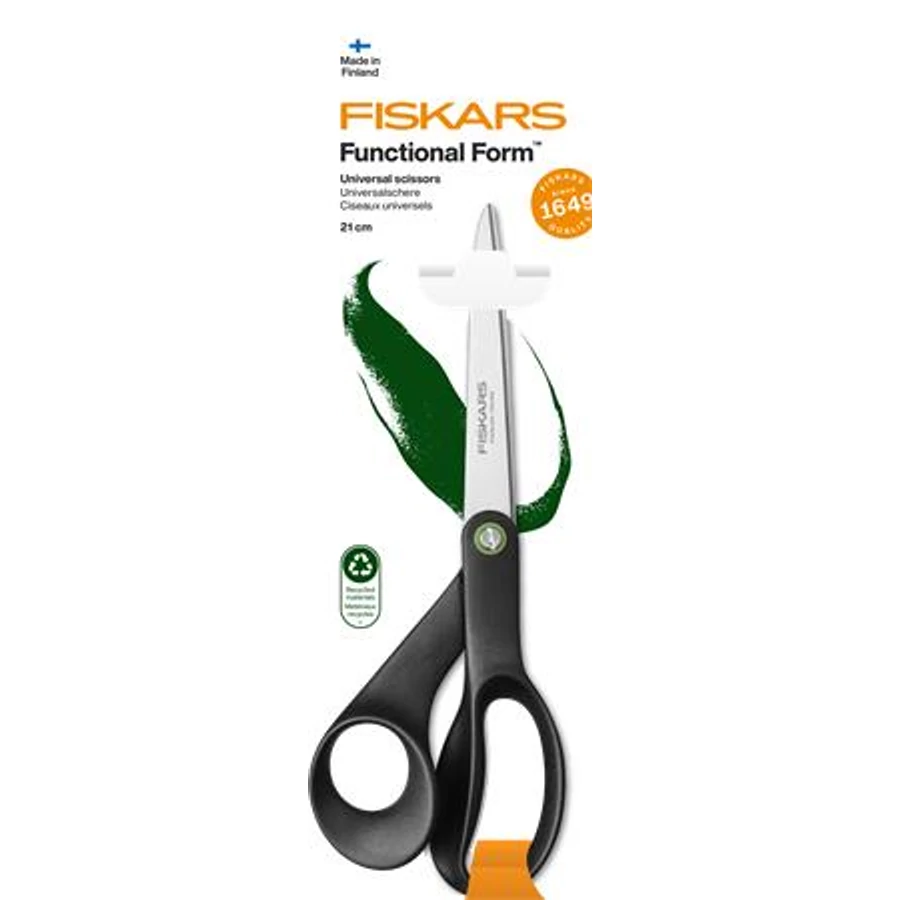 A Fiskars Functional Form ReNew univerzális olló újrahasznosított anyagokból készül (minimum 70%) az egyedülálló kényelem és vágási teljesítmény érdekében