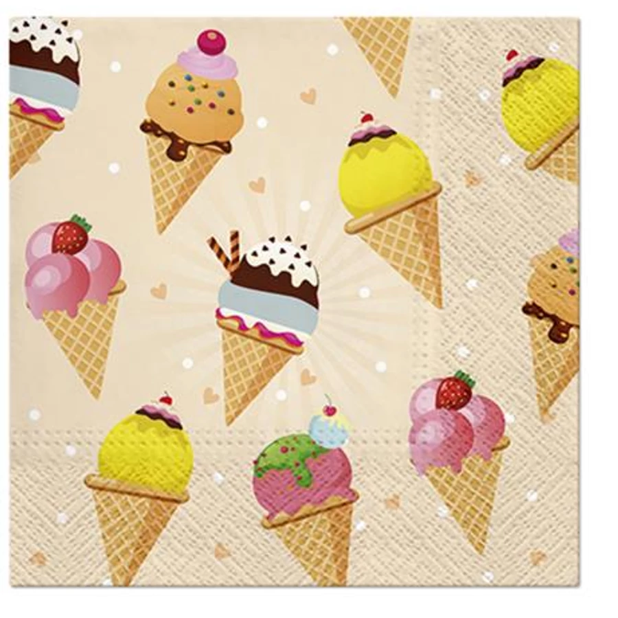 Kerti partikhoz, sütögetős bulikhoz, születésnapokhoz ajánljuk ezt a színes fagyi mintás szalvétát, amelyet kiegészíthetsz hozzá illő tányér és pohár együttesével.