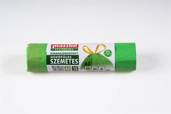Szemeteszsák, újrahasznosított, húzófüles, 40 l, 15 db, 55x62 cm, 16 µ, MAZZINI, zöld