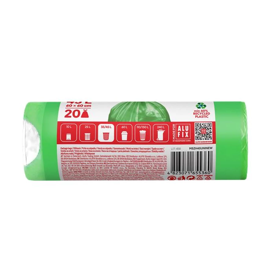 Prémium minőségű, nagy teherbírású szemeteszsák. Minden Alufix szemeteszsák újrahasznosított műanyag felhasználásával készül. Amikor Alufix szemeteszsák mellett dönt, a Föld erőforrásainak körforgását támogatja.