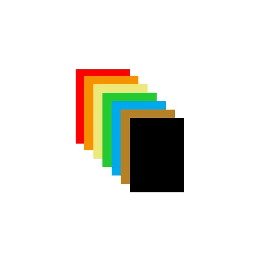 színösszeállítás: 15-15 ív vörös, narancssárga, sárga, limezöld, vízkék, világos barna, 10 ív fekete