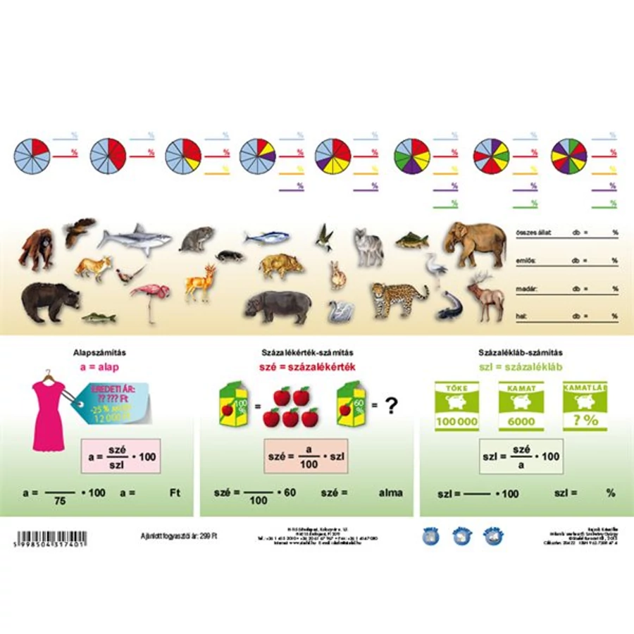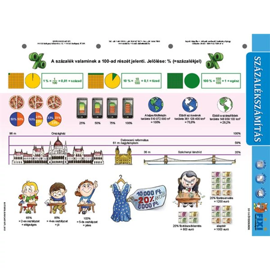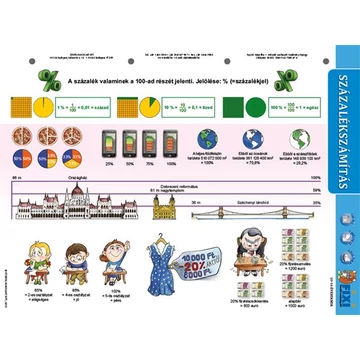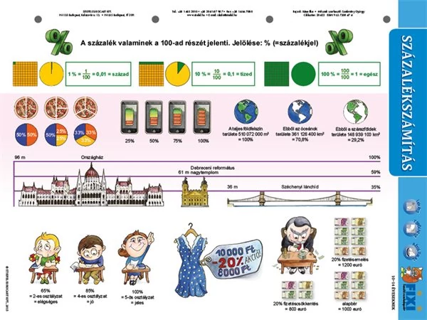 A Százalékszámítás című tanulói munkalap a felső tagozatosok matematikai képzésének kitűnő kiegészítője. A négy alapművelet után a leggyakoribb, legfontosabb matematikai művelet, amelyet majd a nebulók felnőtt életük során használnak éppen a százalékszámítás A pedagógusok a százalék és a százalékszámítás fogalmának megértését a jól érthető, egyszerű példák minél nagyobb számban történő felvonultatásával szokták áthidalni, mint a varrónői mérőszalagok vagdosása, fapálcikák, dominók rakosgatása, száz centis vonalzó bemutatása… Ezt a munkát könnyíti meg nagymértékben Százalékszámítás munkalap, amely nemcsak a lehető legegyszerűbb, jópofa illusztrációk segítségével érteti meg a tanulókkal a százalék fogalmát, de néhány játékos feladattal is bír. A haladók számára pedig a termék három, a százalékszámítás alapképleteit is bemutató, oda vissza megoldható példát is bemutat.