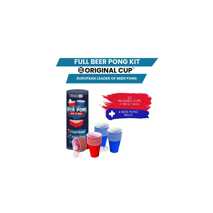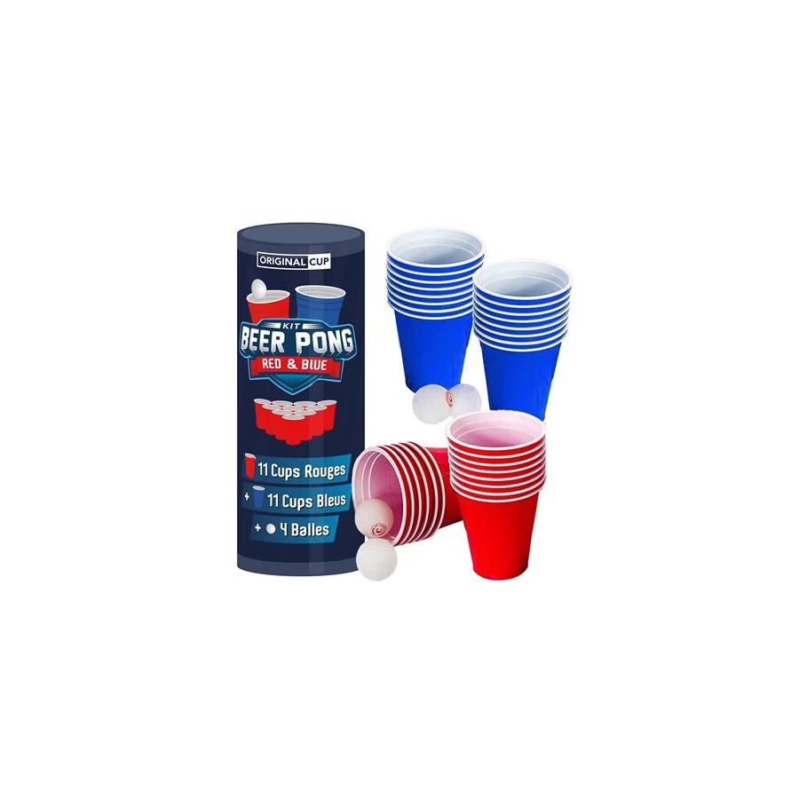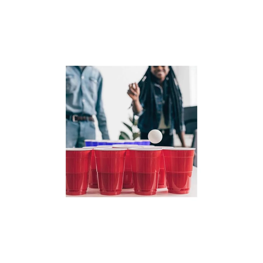 -ebben a szettben 11-11 db kék és piros újrahasználható műanyag poharat találsz + 4 db pingpong labdát