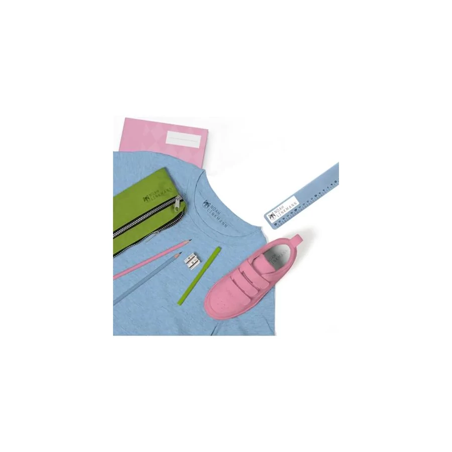 A csomagban lévő vasalható szalag a sötét ruhákon teszi láthatóvá a jelölést. A címkéket használja kulacsra, tolltartóra, táskára.