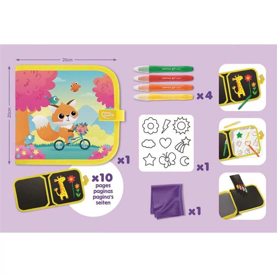 Az újrahasználható és könnyen hordozható könyvnek köszönhetően a kreativitás bárhol, bármikor szabadon szárnyalhat. Elég csak elővenni a készletben található zsírkrétákat, és már kezdődhet is az alkotás! A tisztítókendővel könnyedén letörölhető a rajz, így a végtelenségig rajzolhatnak újra és újra. Szórakoztató és fejlesztő készlet, ami ideális a képzelőerő ösztönzésére, az önállóság fejlesztésére és a kreativitás kibontakoztatására.