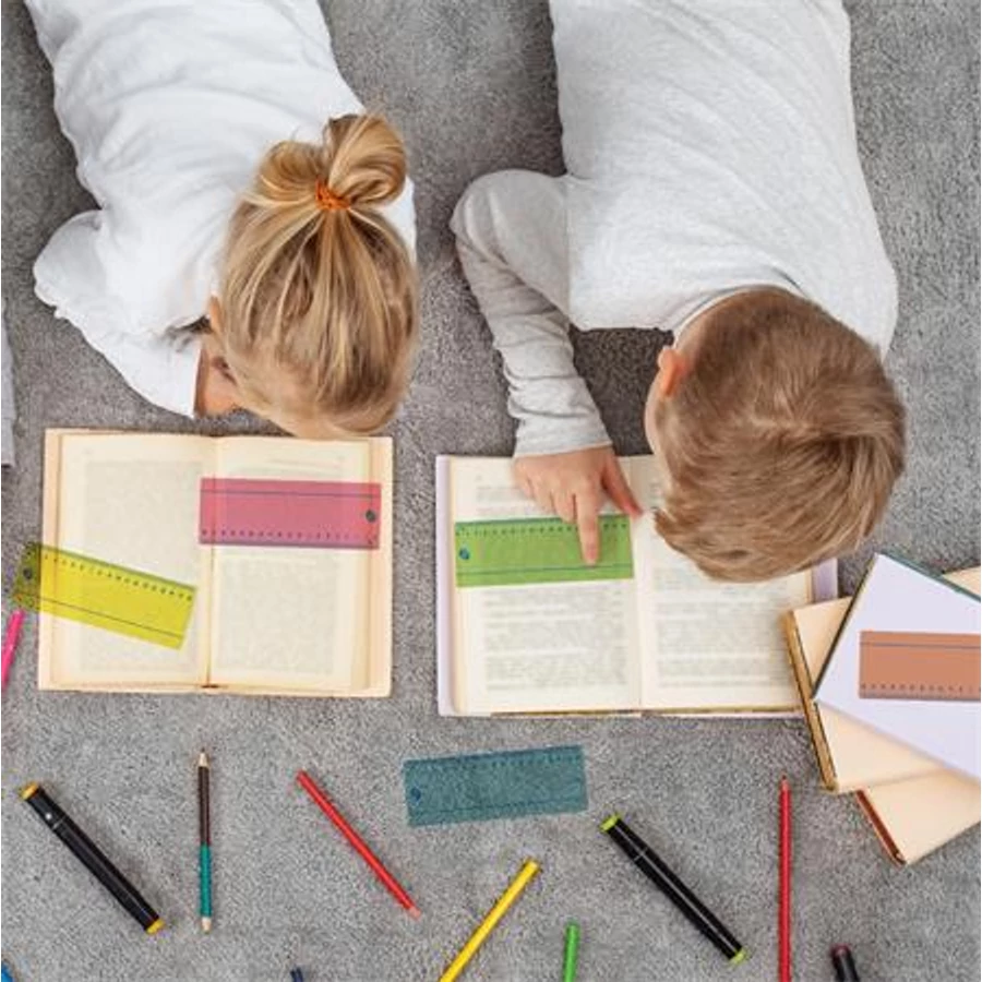 Speciális írást és olvasás segítő színes vonalzó készlet, hasznos zárható tokban.